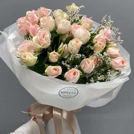 Букет Розовые сладость из 7 веток кустовой пионовидной розы в черном оформлении