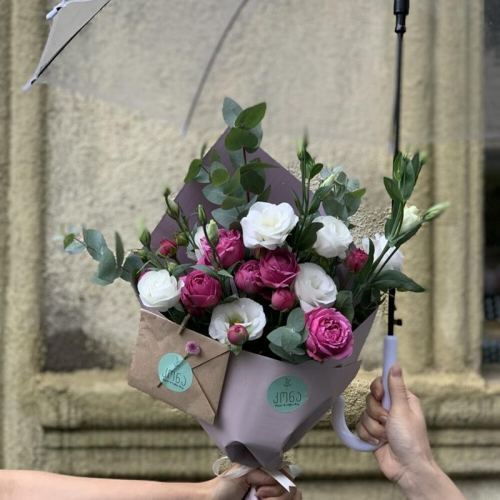 spray peony rose – 5 шт. white eustoma – 5 шт. Eucalyptus – 7 шт.