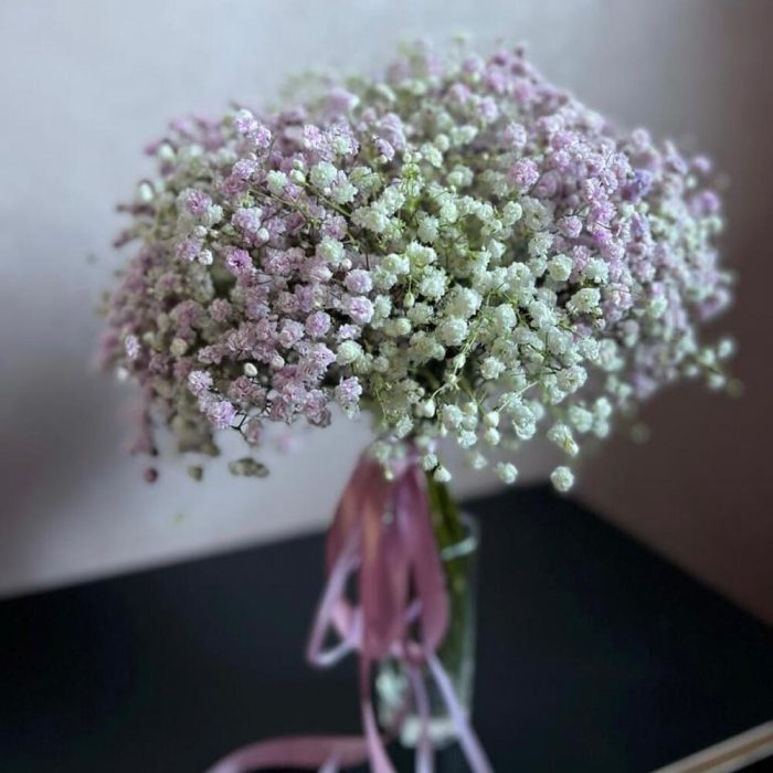 гипсофила белая – 5 шт.Гипсофила фиолетовая – 4 шт.Атласная лента – 1 шт.открытка с правилами ухода за свежими цветами – 1 шт.