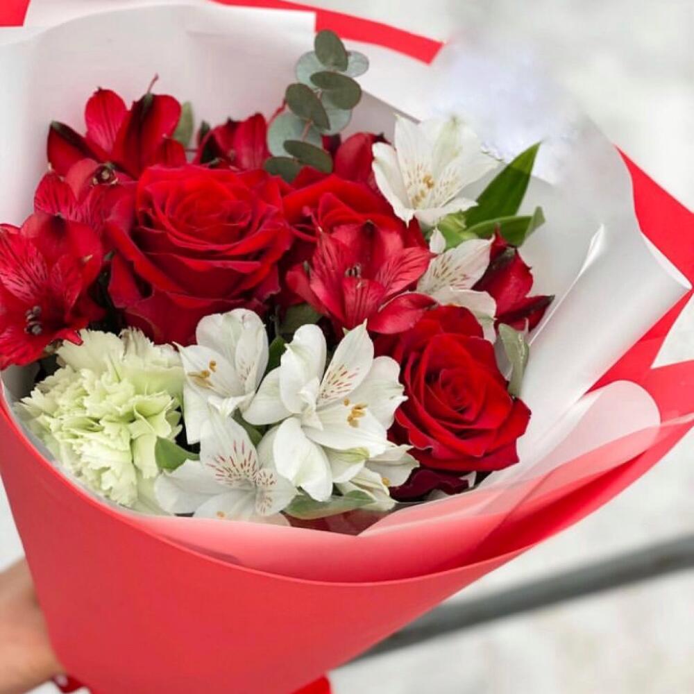 Букет с красной альстромерией и розой «Вкус страсти»