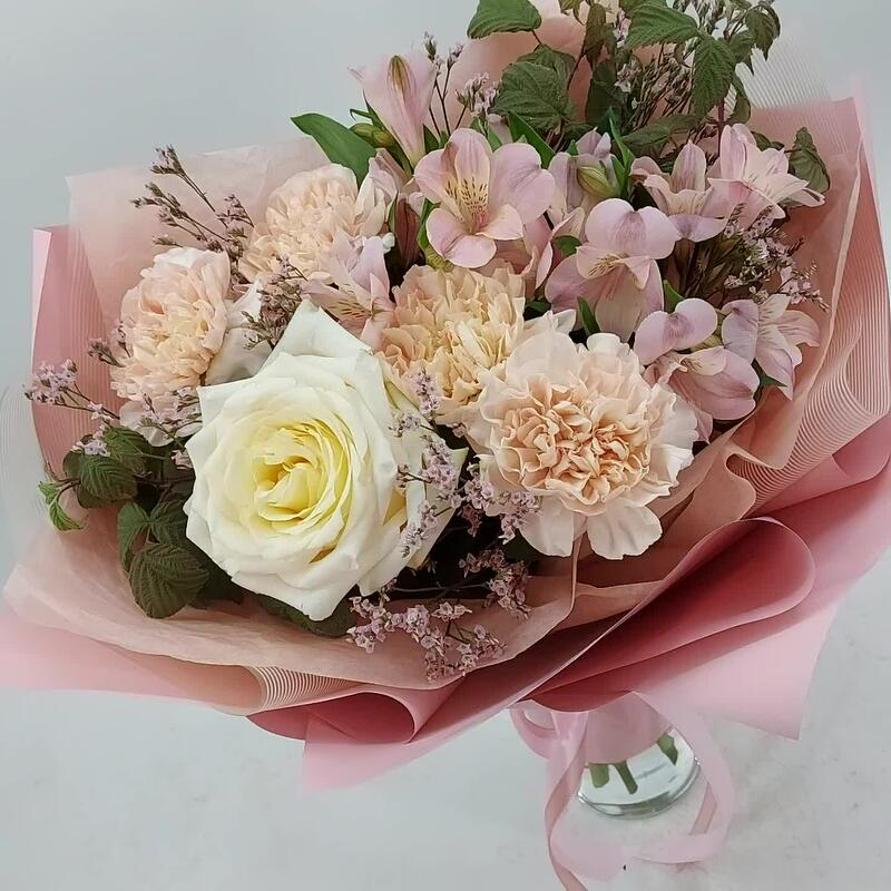 Лимониум – 2 шт.Зелень – 4 шт.Упаковка дизайнерская – 1 шт.альстромерия премиум – 2 шт.гвоздика сортовая (диантус) – 4 шт.роза пионовидная кэндллайт – 1 шт.