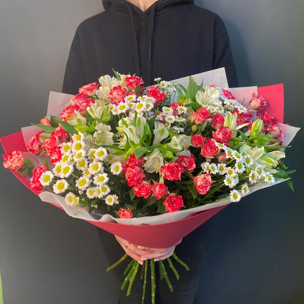 Альстромерии, Кустовые розы, Лизиантусы, Пионовидные розы, Розы, Ромашки