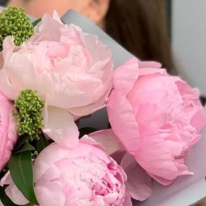 Пион розовый – 5 шт.декоративная зелень – 5 шт.Упаковка дизайнерская – 1 шт.Лента атласная – 2 шт.Открыточка с вашими пожеланиями – 1 шт.хорошее настроение – 100 шт.инструкция по уходу за цветами – 1 шт.коробка переноска – 1 шт.Кризал – 1 шт.