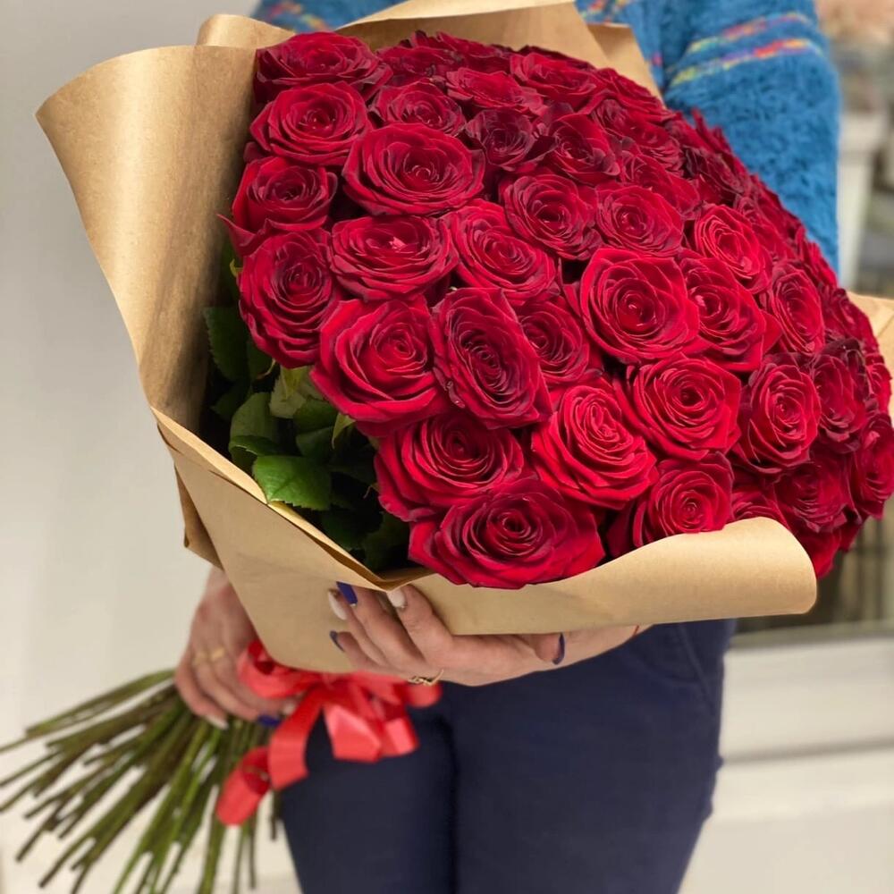 розы эквадор (60 см) – 51 шт.Крафт дизайнерский – 2 шт.Лента атласная – 1 шт.