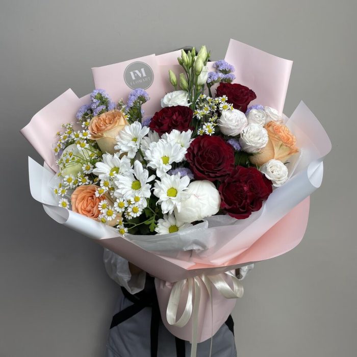 Альстромерии, Кустовые розы, Лизиантусы, Пионовидные розы, Розы, Ромашки
