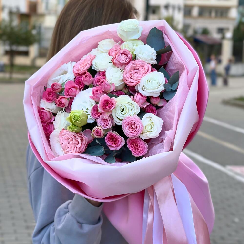 веточная роза (веток) – 6 шт. эустома (веток) – 4 шт. Эвкалипт – 2 шт. Упаковка – 1 шт. Атласная лента – 1 шт.