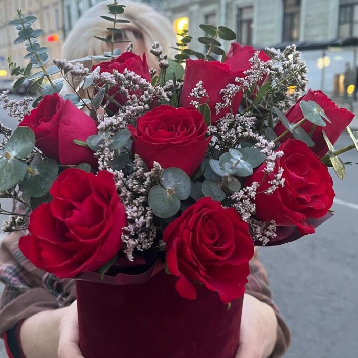 Лимониум – 1 шт.Оазис флористический – 1 шт.Эвкалипт Baby Blue – 4 шт.роза кения красная – 9 шт.шляпная коробка бордовая бархатная малая – 1 шт.