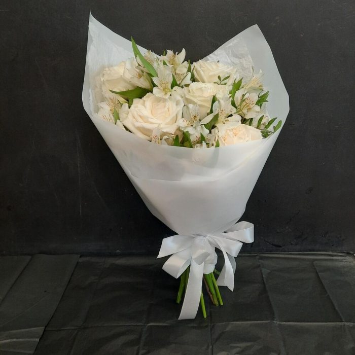 Роза Эквадор – 5 шт.Альстромерия – 7 шт.Фисташка – 3 шт.Тишью – 1 шт.Калька упаковка – 1 шт.Лента атласная – 2 шт.