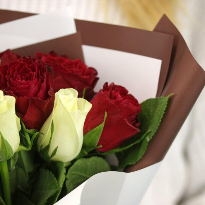 Букет из 11 красных и белых роз микс 35-40 см (Кения) в стильной упаковке