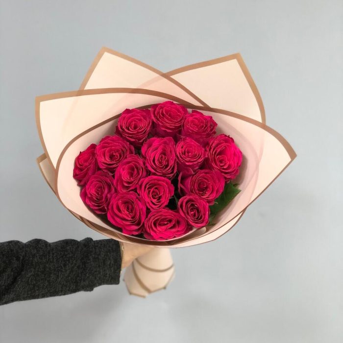 Букет из 15 малиновых роз с оформлением