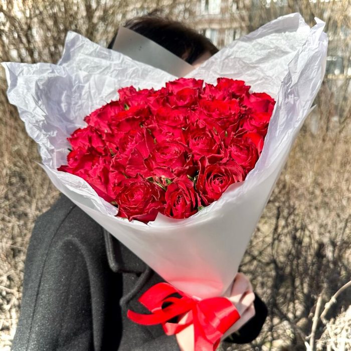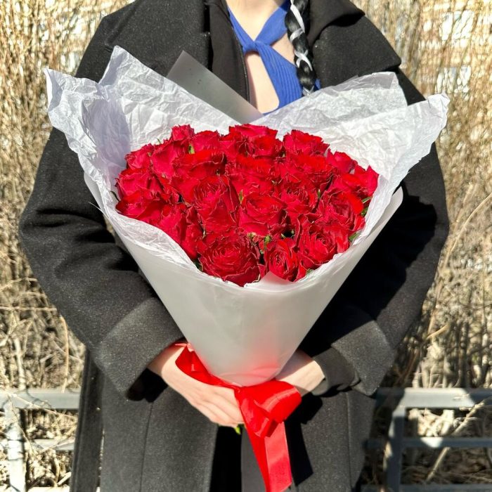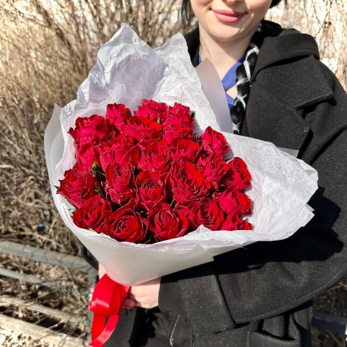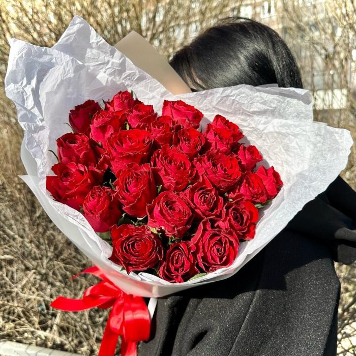 Роза – 25 шт.Лента атласная – 1 шт.Пленка матовая – 2 шт.Открыточка с вашими пожеланиями – 1 шт.