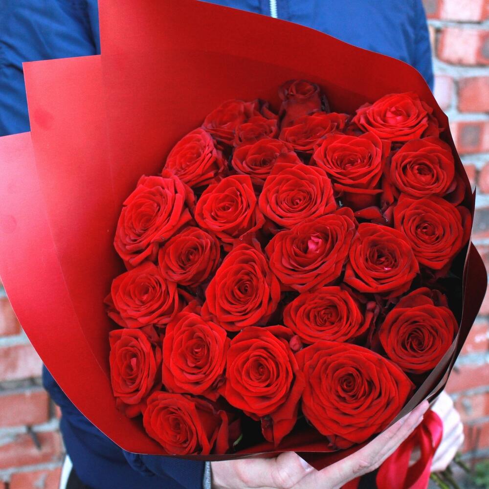 Букет из 25 красных роз в упаковке