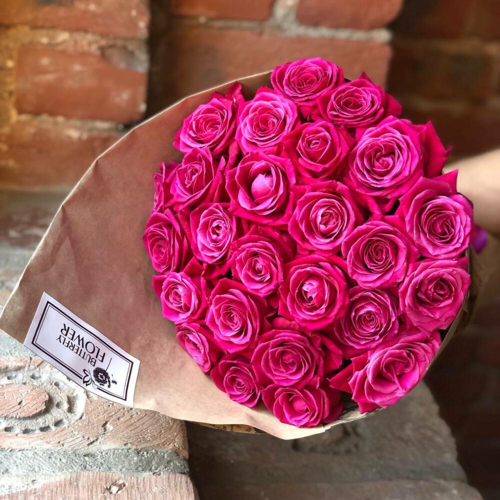 Букет из 25 розовых роз в стильной упаковке “Взрывная фуксия”