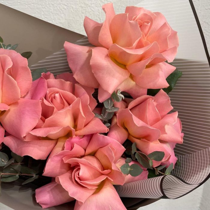 Эвкалипт – 3 шт.Лента атласная – 2 шт.Упаковка дизайнерская – 2 шт.Эквадор роза – 5 шт.