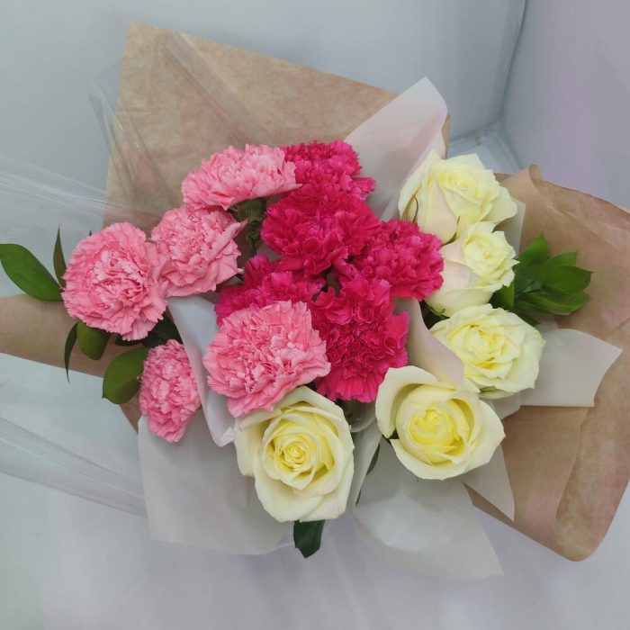 роза кения 40 см – 5 шт.диантусы микс – 10 шт.Рускус – 2 шт.Дизайнерская упаковка – 1 шт.