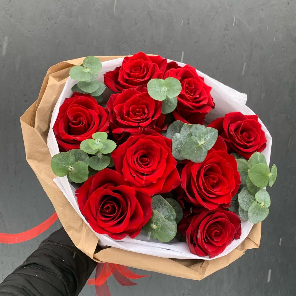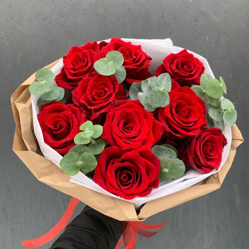 Букет из 9 красных роз с эвкалиптом