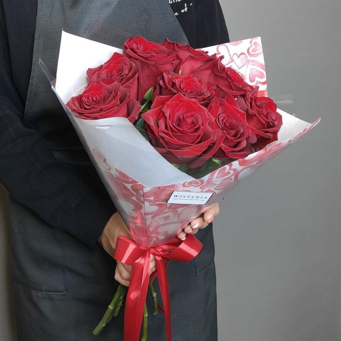 Лента атласная – 1 шт.Упаковка дизайнерская – 1 шт.Роза одноголовая эквадор – 9 шт.