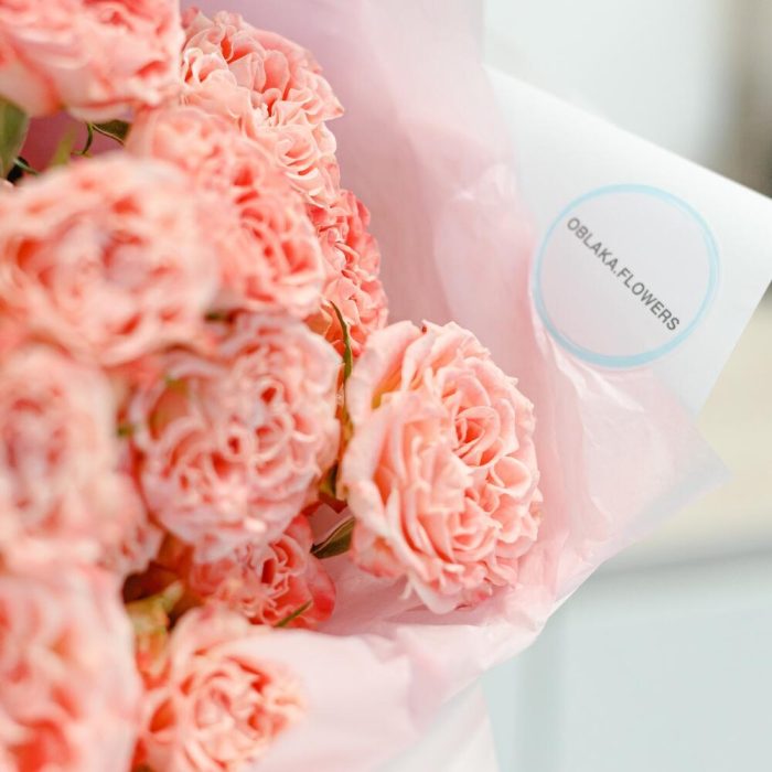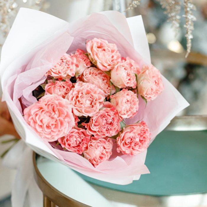 Роза кустовая пионовидная – 5 шт.Тишью – 2 шт.Корейская пленка – 2 шт.Атласная лента – 1 шт.инструкция по уходу за цветами – 1 шт.крафтовый пакет – 1 шт.