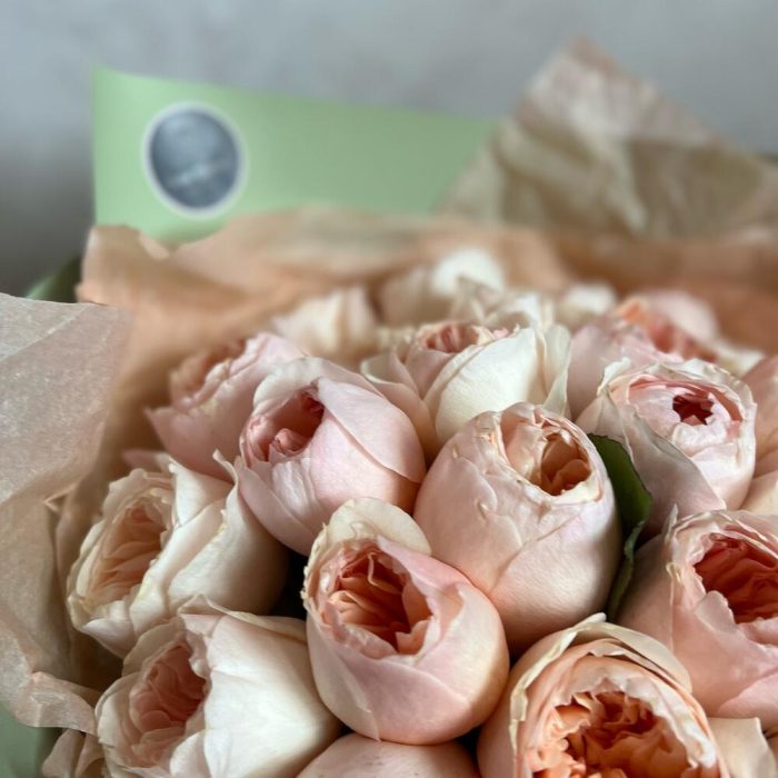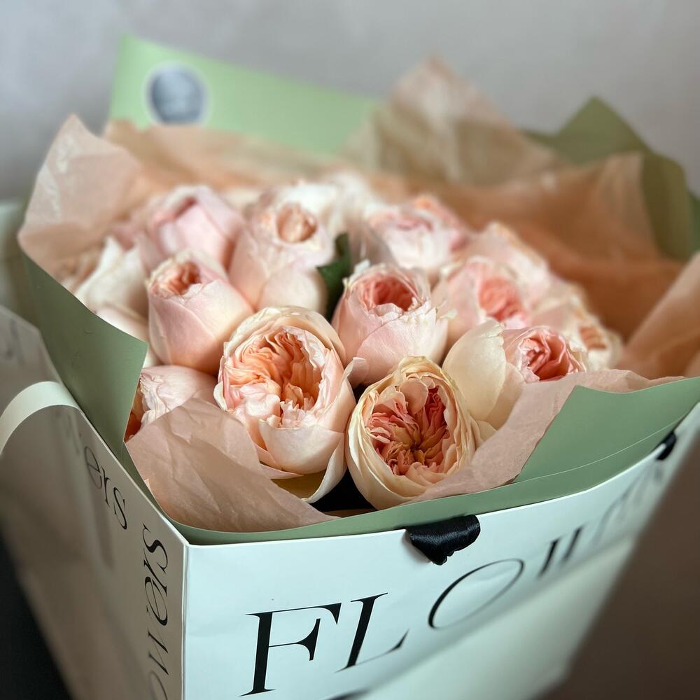 Атласная лента – 1 шт.декоративная упаковка – 1 шт.садовая пионовидная розаjulieta – 29 шт.
