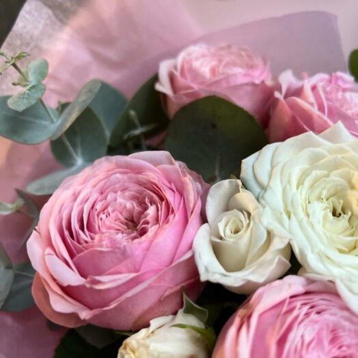 Пионовидная роза кустовая – 2 шт.кустовая роза жанин – 2 шт.Эвкалипт – 3 шт.декоративная упаковка – 2 шт.Атласная лента – 2 шт.