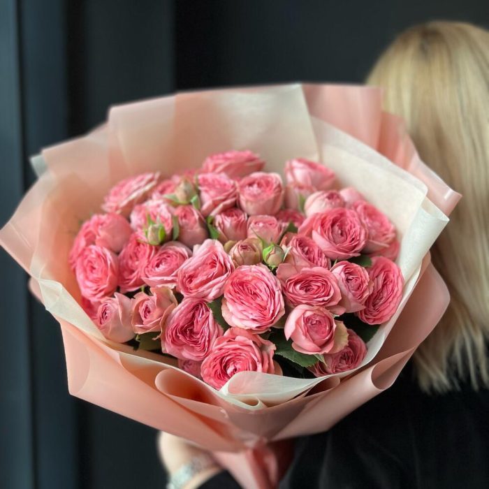 Атласная лента – 1 шт.Кустовая пионовидная роза – 9 шт.декоративная упаковка – 1 шт.