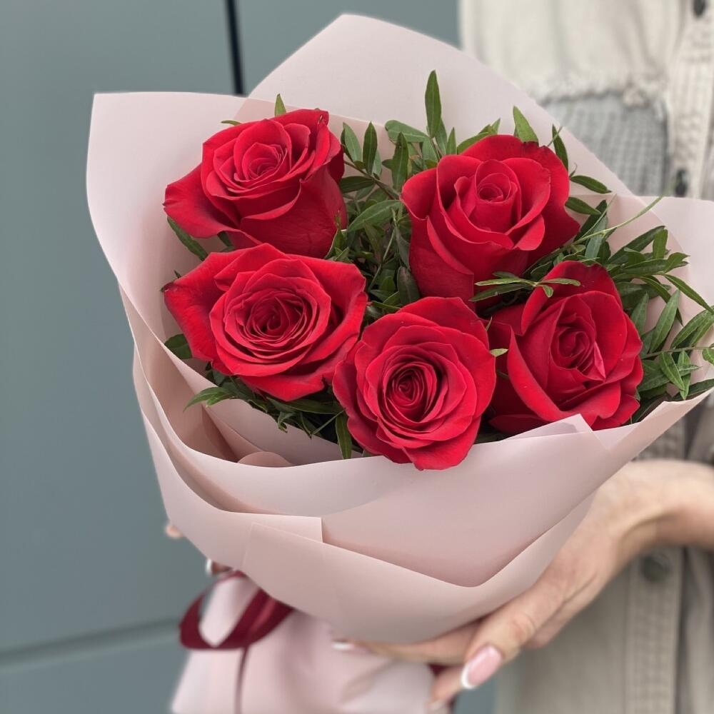 красные розы – 5 шт.зелень декоративная – 5 шт.Упаковка – 5 шт.Лента атласная – 1 шт.работа флориста – 1 шт.