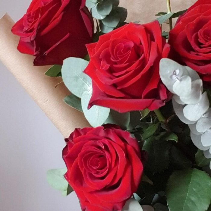 Эвкалипт – 5 шт.Упаковка – 2 шт.Лента атласная – 1 шт.Роза Эксплорер – 5 шт.