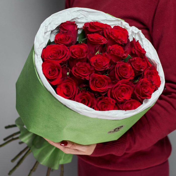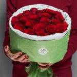 Букет красных роз в зеленой упаковке