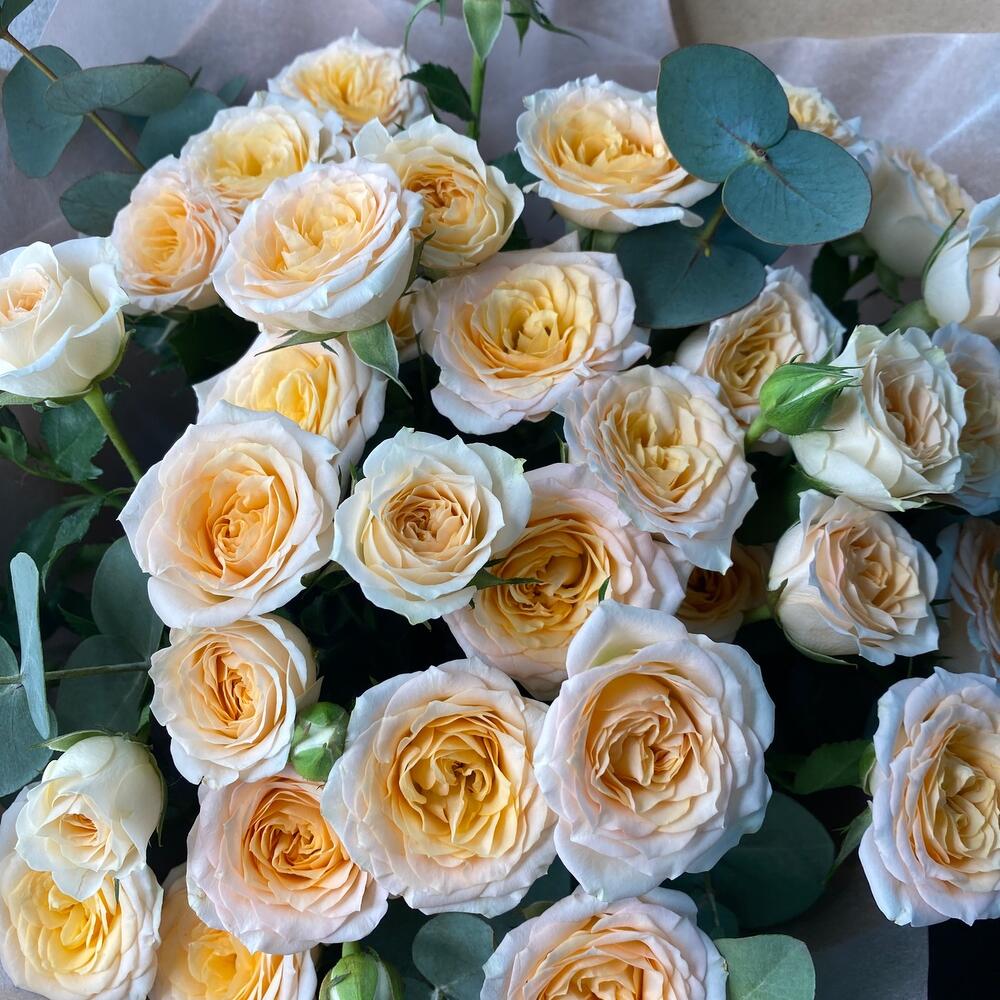 Роза кустовая – 5 шт.Крафт дизайнерский – 4 шт.Эвкалипт ценария – 2 шт.