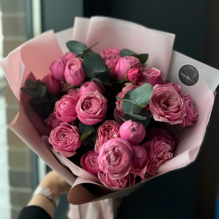 Кустовая пионовидная роза – 5 шт.Эвкалипт – 5 шт.декоративная упаковка – 1 шт.Атласная лента – 1 шт.