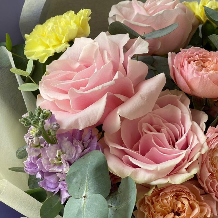 Лента – 2 шт.Маттиола – 3 шт.Эвкалипт – 2 шт.Роза одноголовая – 5 шт.Гвоздика – 5 шт.Упаковка дизайнерская – 2 шт.Кризал (подкормка) – 2 шт.Открытка мини – 1 шт.Роза кустовая джульетта – 3 шт.