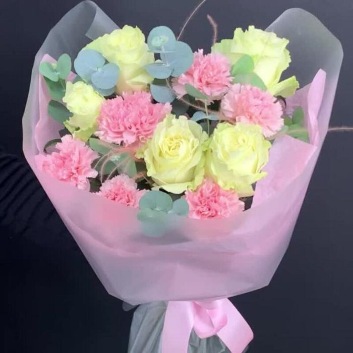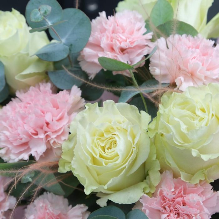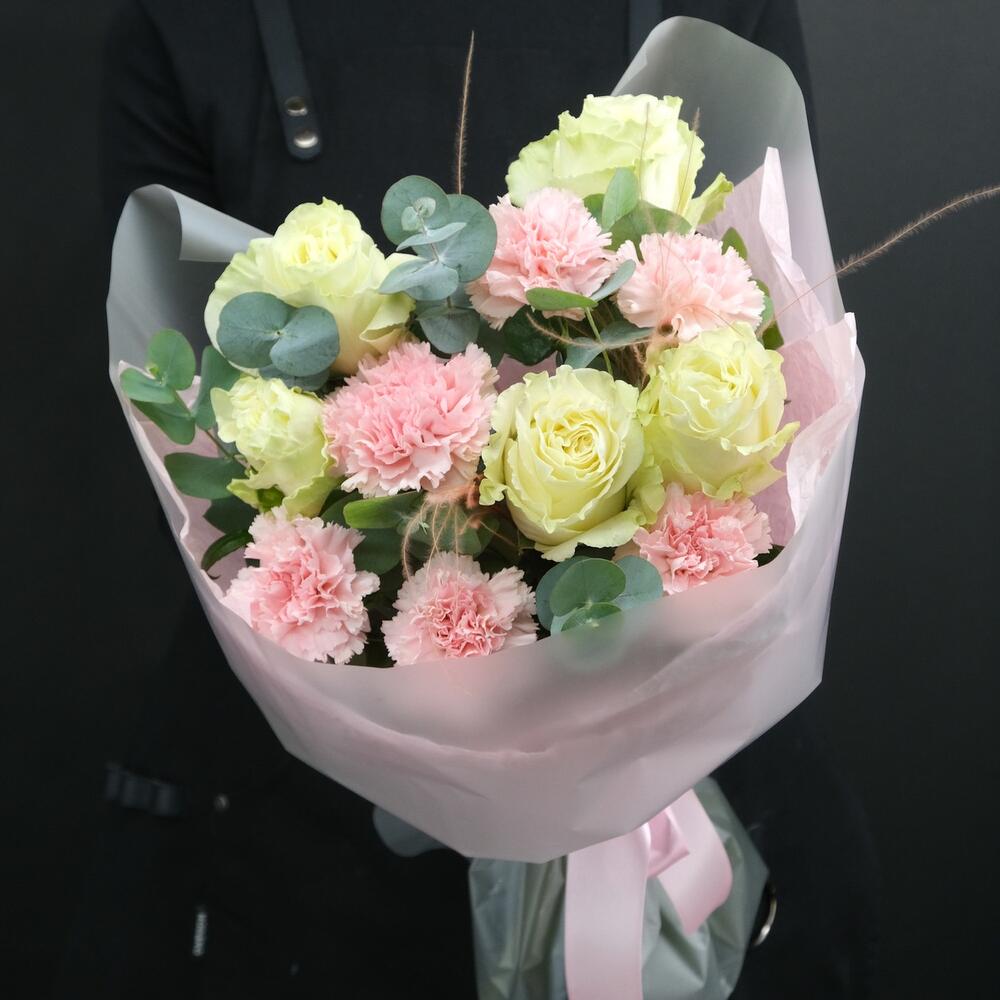 Эвкалипт – 1 шт.Роза – 5 шт.Упаковка – 1 шт.Диантус – 6 шт.Стифа – 2 шт.Инструкция по уходу – 1 шт.подкормка для срезанных цветов – 1 шт.