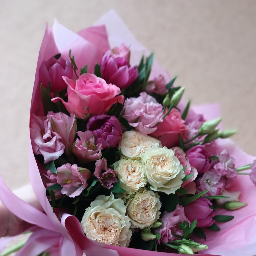 Категорий: Альстромерии, Кустовые розы, Лизиантусы, Розы, Тюльпаны