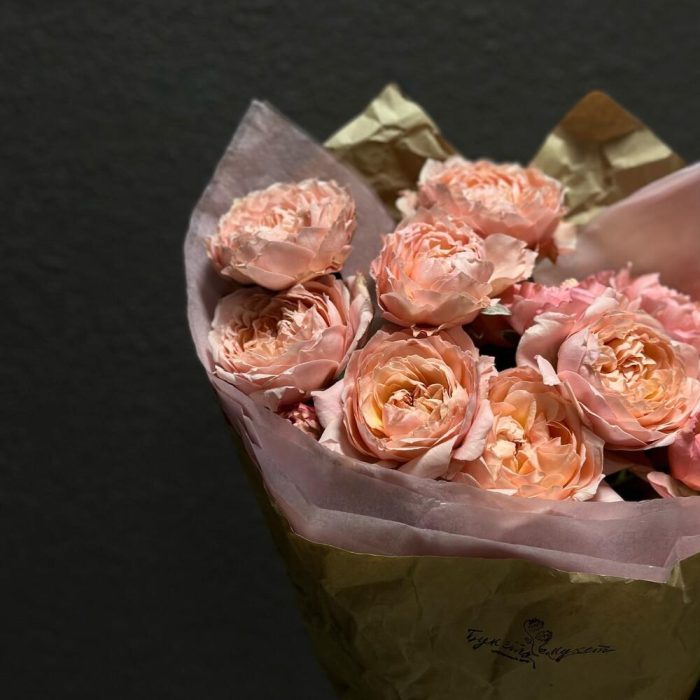 Лента атласная – 1 шт.Тишью – 2 шт.Крафт – 1 шт.Роза пионовидная Джульетта – 3 шт.