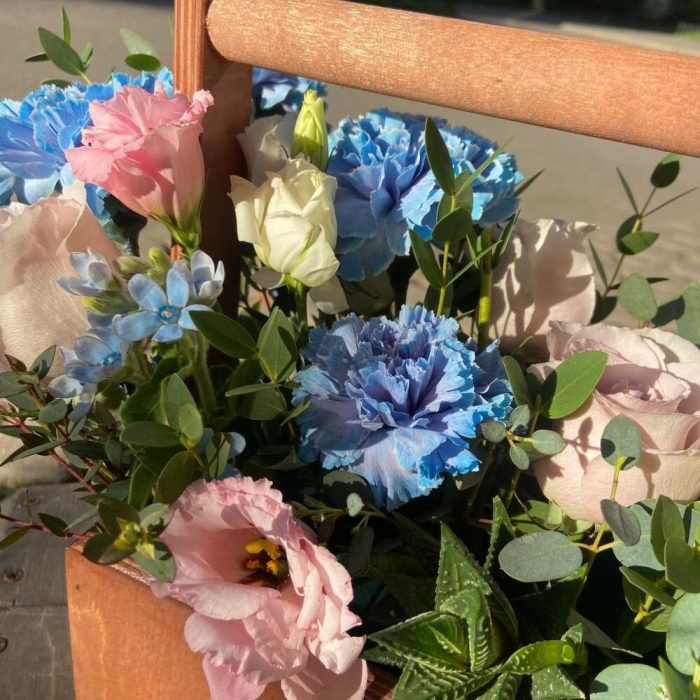 Дельфиниум – 1 шт.Лизиантус – 2 шт.Эвкалипт – 1 шт.Роза Эквадор – 6 шт.Оксипеталум – 2 шт.Ящик деревянный – 1 шт.Оазис флористический – 1 шт.Хавортия – 1 шт.Диантус сортовой – 6 шт.