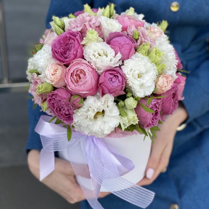 Коробка шляпная – 1 шт. Оазис – 1 шт. Лента – 2 шт. Misty Bubbles пионовидная роза – 3 шт. Сильвия – 2 шт. Бомбастик роза – 1 шт. Писташ – 1 шт. Эустома алиса – 4 шт.