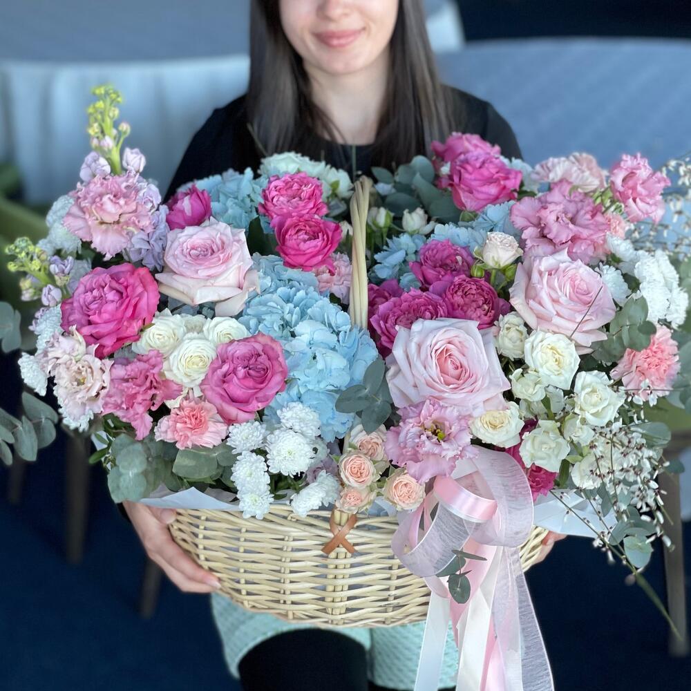 Корзина с голубыми гортензиями