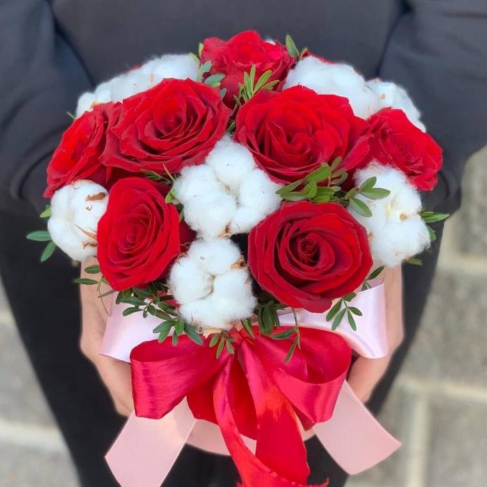 Коробка шляпная – 1 шт.Оазис флористический – 1 шт.Фисташка – 2 шт.Роза Эквадор – 9 шт.Хлопок натуральный – 9 шт.