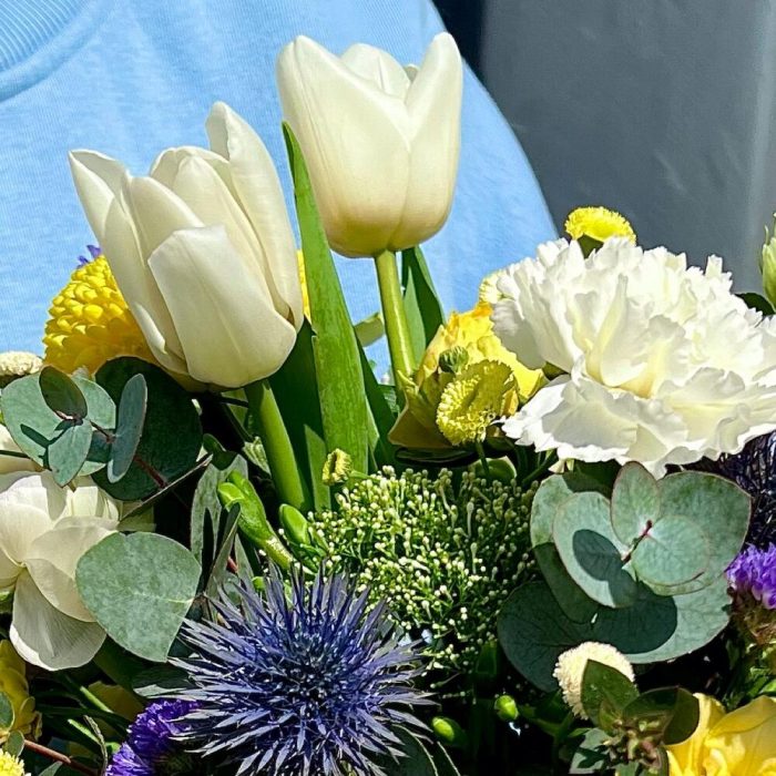 Статица – 1 шт.Трахелиум – 1 шт.Тюльпан – 3 шт.Фрезия – 2 шт.Диантус – 4 шт.Матрикария – 2 шт.Ваза стекло – 1 шт.Роза кустовая пионовидная – 1 шт.комплимент от polyanka – 1 шт.эрингим – 1 шт.