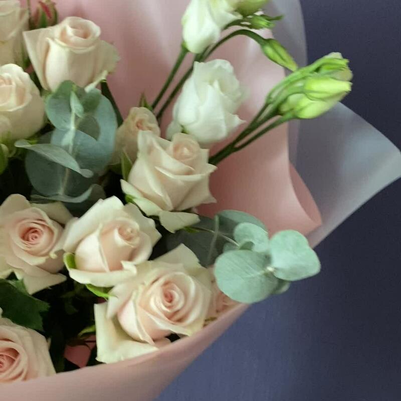 Роза кустовая – 5 шт.Лизиантус – 4 шт.Эвкалипт – 3 шт.Матовая пленка – 4 шт.Лента атласная – 1 шт.