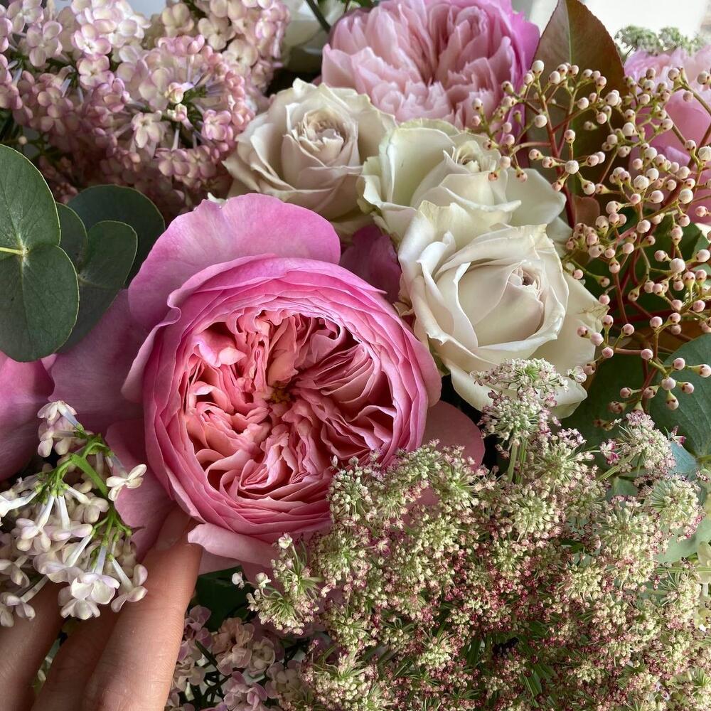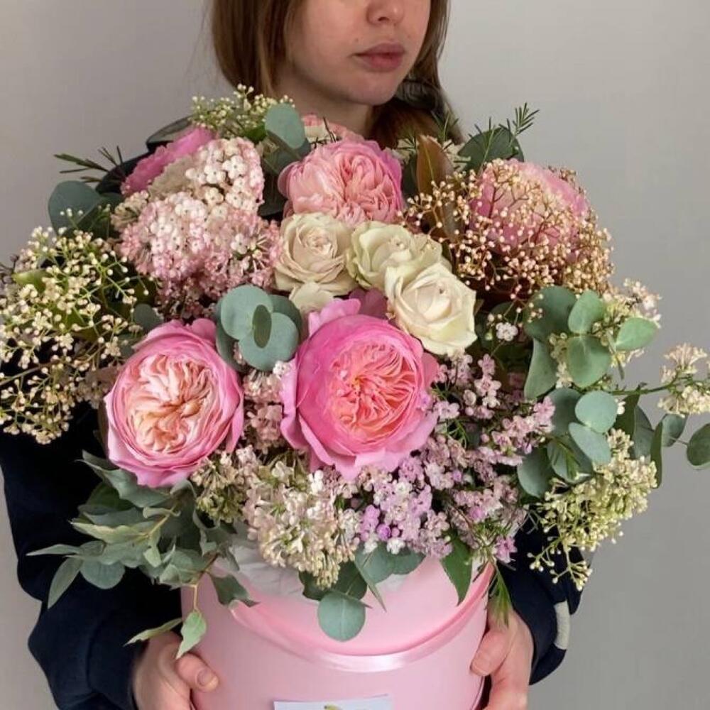 Роза пионовидная – 7 шт.Роза кустовая пионовидная – 3 шт.Сирень – 3 шт.фотиния – 2 шт.Ваксфлауэр – 2 шт.Эвкалипт – 6 шт.Оазис флористический – 2 шт.Шляпная коробка – 1 шт.