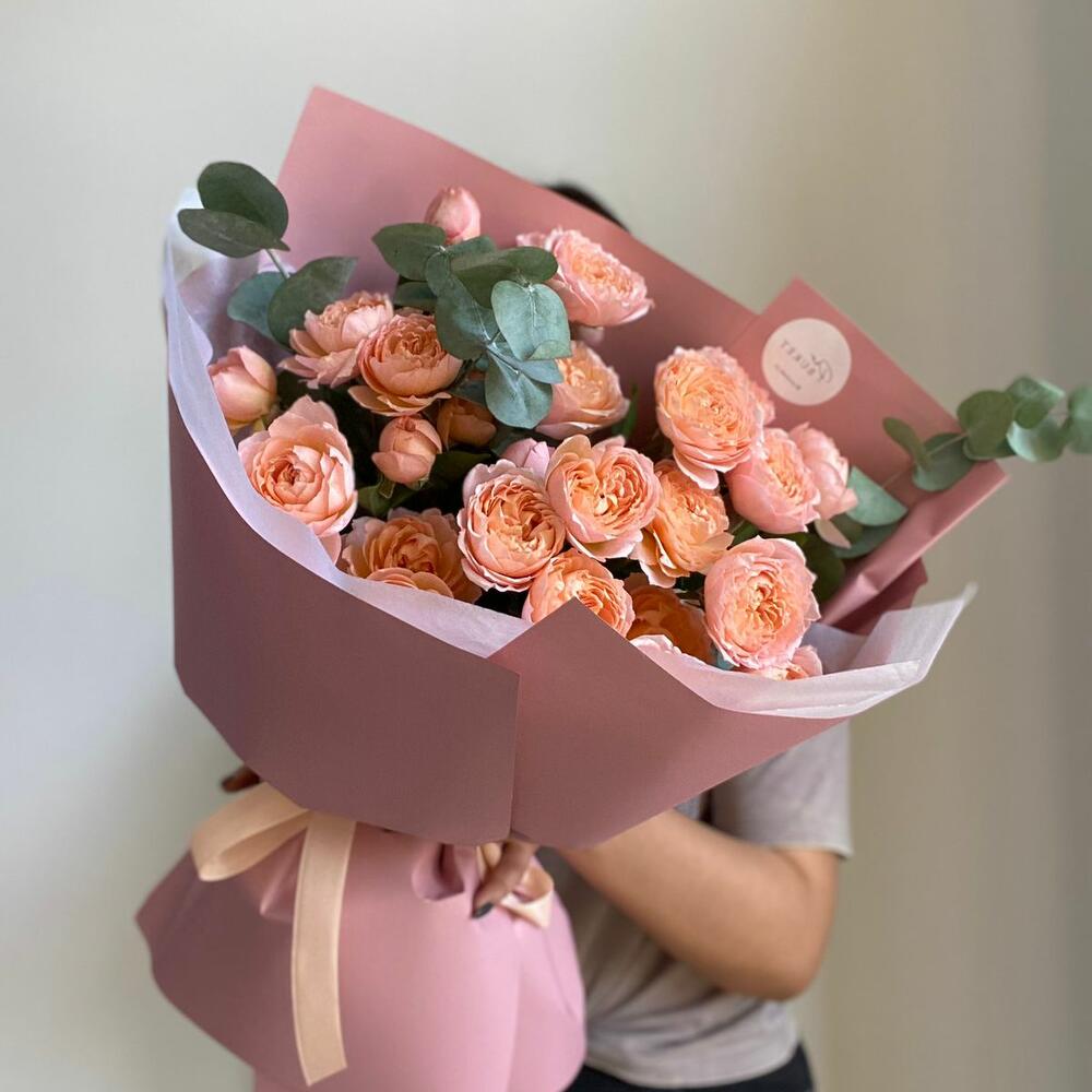 9 пионов корал шарм с эвкалиптом