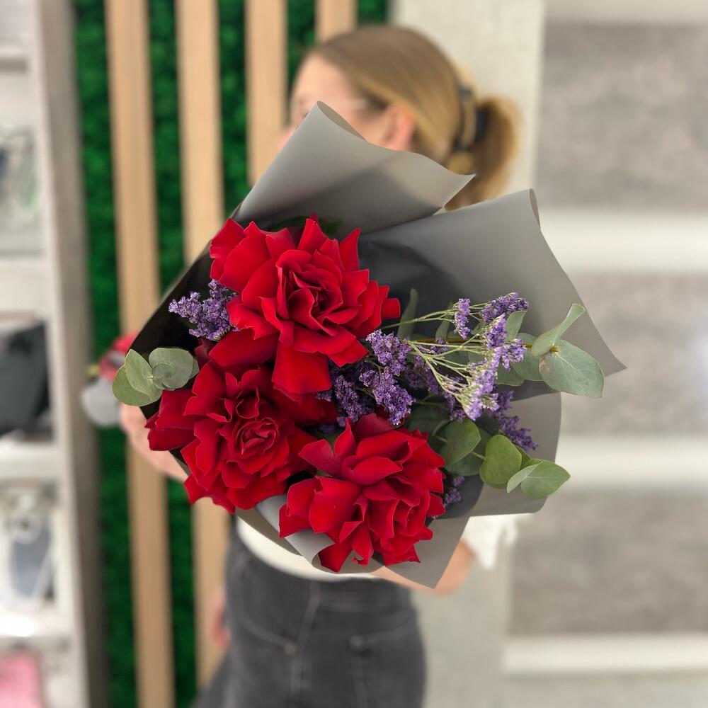 Лимониум – 1 шт.Эвкалипт – 1 шт.Лента атласная – 1 шт.Роза фридом – 3 шт.Пленка матовая – 1 шт.