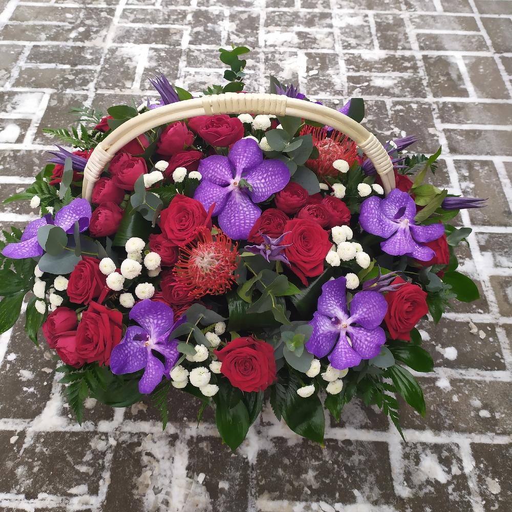 Роза – 15 шт.Роза кустовая пионовидная – 10 шт.Ванда – 7 шт.Клематис – 10 шт.Зелень – 30 шт.Корзина – 1 шт.Оазис – 5 шт.Хризантема кустовая – 10 шт.
