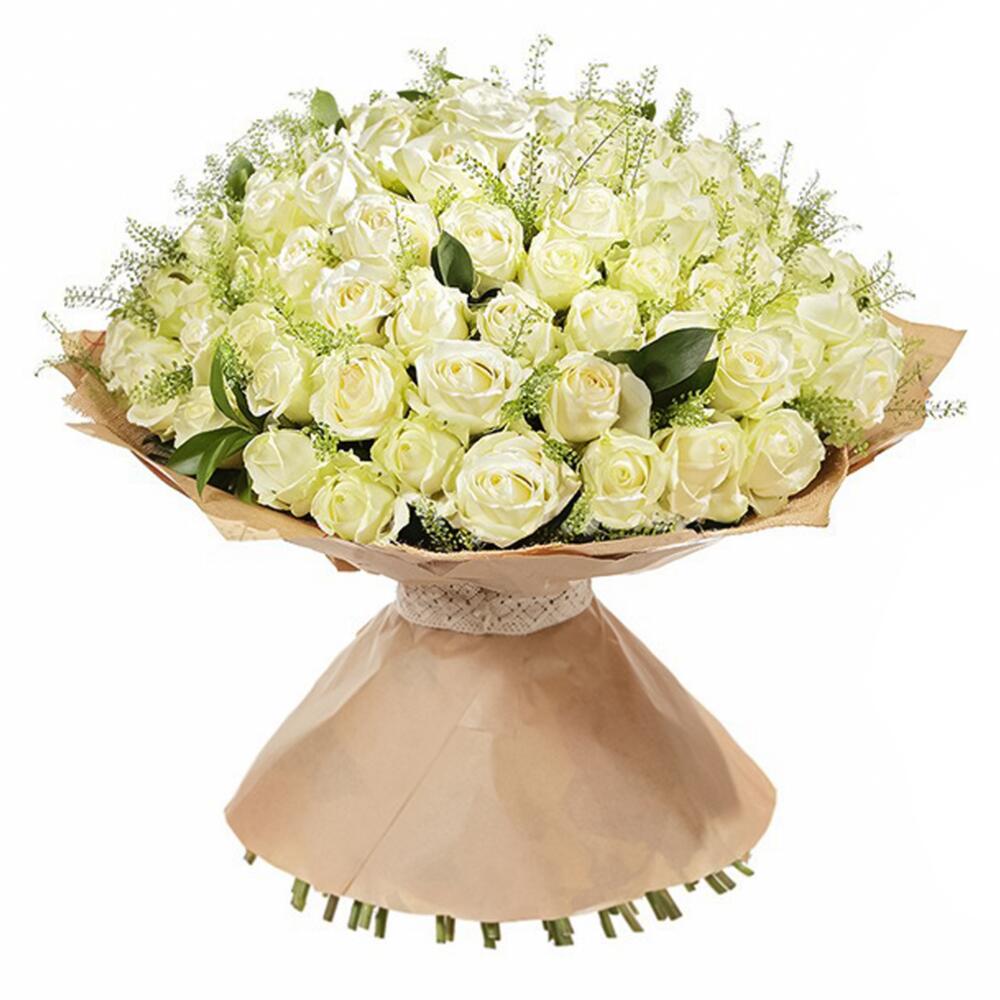 Роза одноголовая – 101 шт.бумага крафт – 1 шт.лента атласная (белый) – 1 шт.