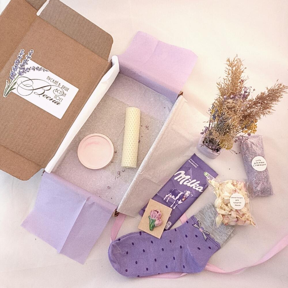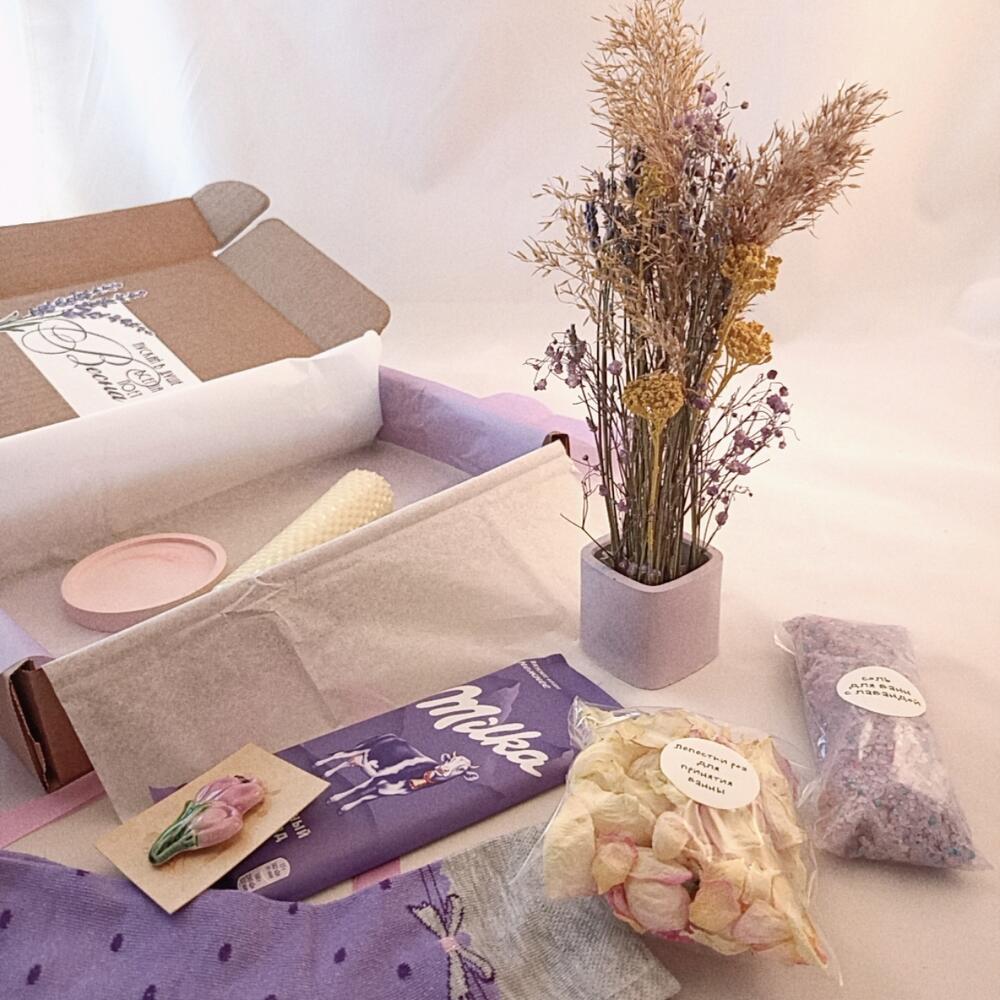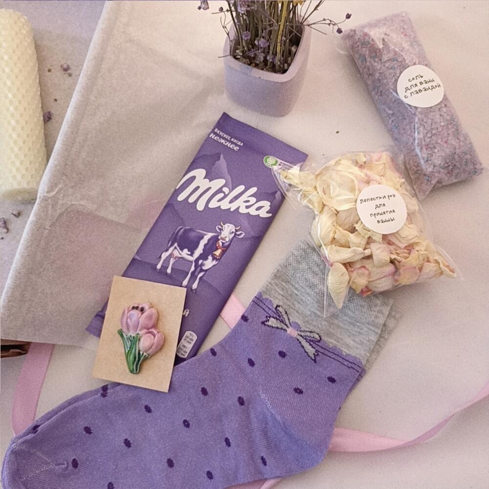 Шоколад – 1 шт.Подарочная упаковка – 1 шт.Лепестки роз – 1 шт.Подсвечник – 1 шт.Соль для ванной – 130 гр.носки женские – 1 шт.букет из сухоцветов – 1 шт.свеча из вощины – 1 шт.брошь ручной работы – 1 шт.