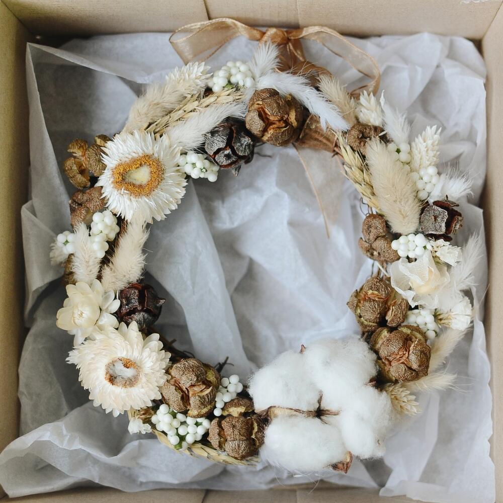 Основа для венка – 1 шт.Хлопок – 1 шт.сухоцветы микс – 1 шт.ветка искусственная белая – 1 шт.Тишью – 1 шт.Коробка – 1 шт.