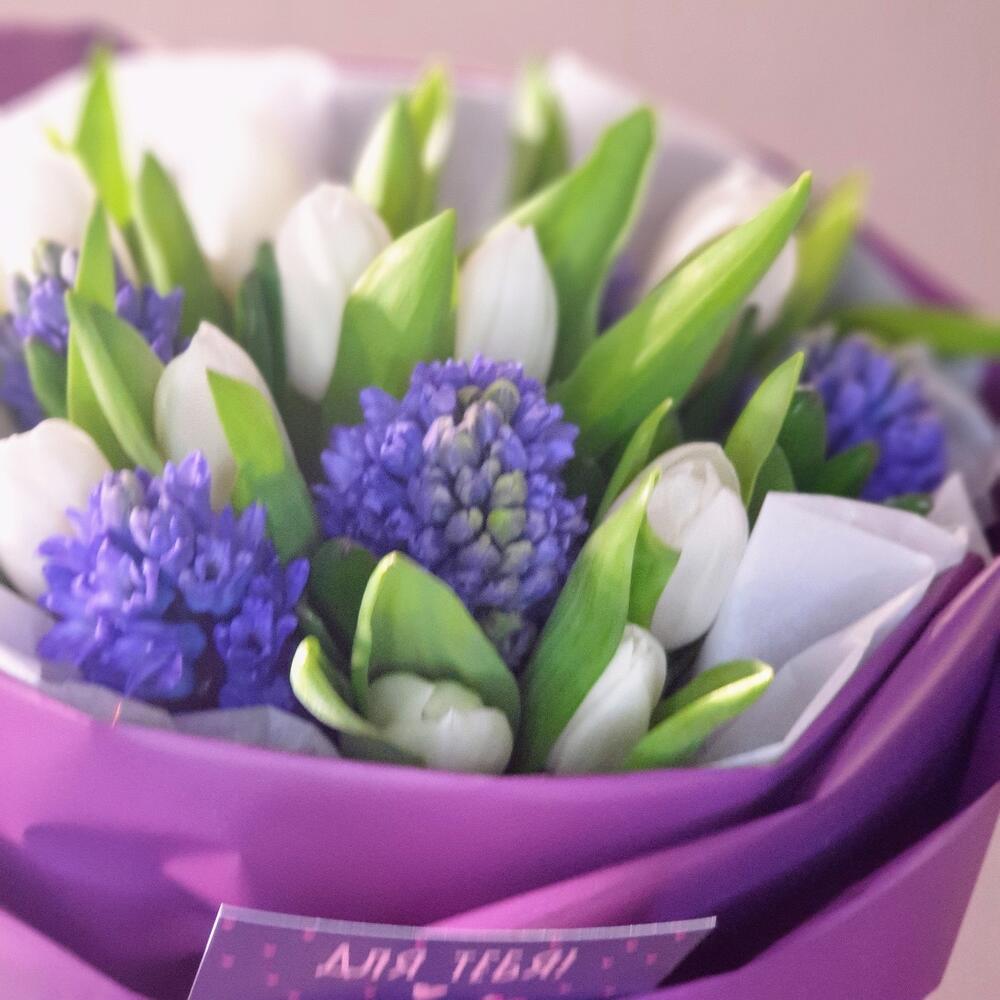 Лента атласная – 1 шт.Пленка матовая – 2 шт.Открыточка с вашими пожеланиями – 1 шт.Тишью белое – 3 шт.тюльпаны белые голландия – 12 шт.гиацинты синие – 5 шт.