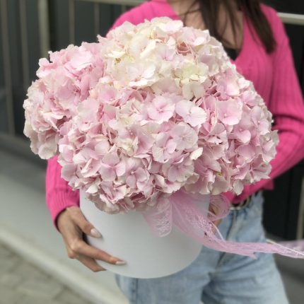 Шляпная коробка с пионовидными лилиями, розами и голубым оксипеталумом
